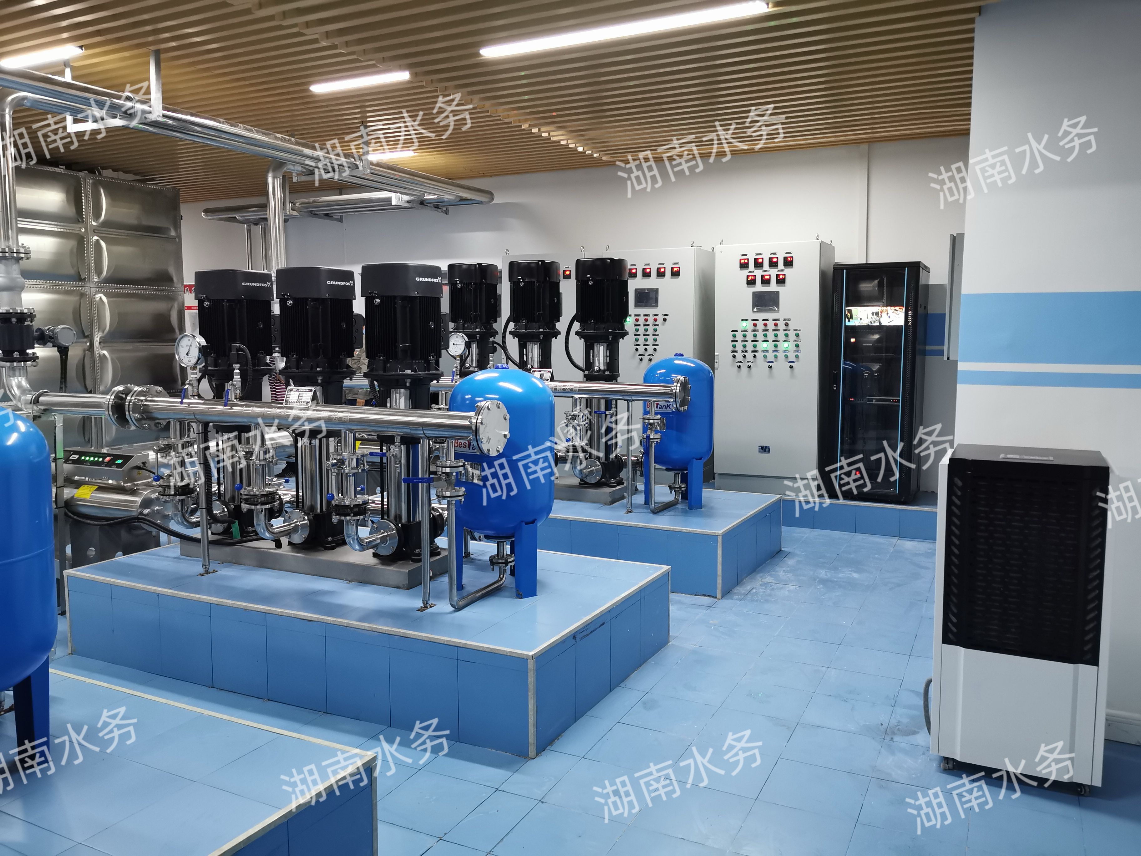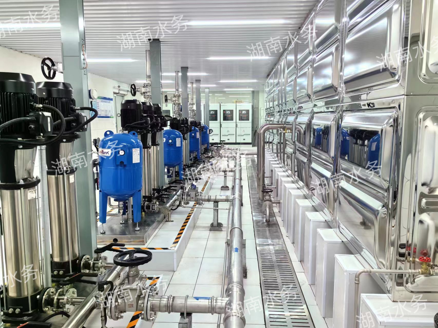 湖南水務(wù)機(jī)電的二次供水泵房由衛(wèi)生級不銹鋼水箱、數(shù)字化變頻控制柜、在線消毒設(shè)備、增壓泵組構(gòu)成。